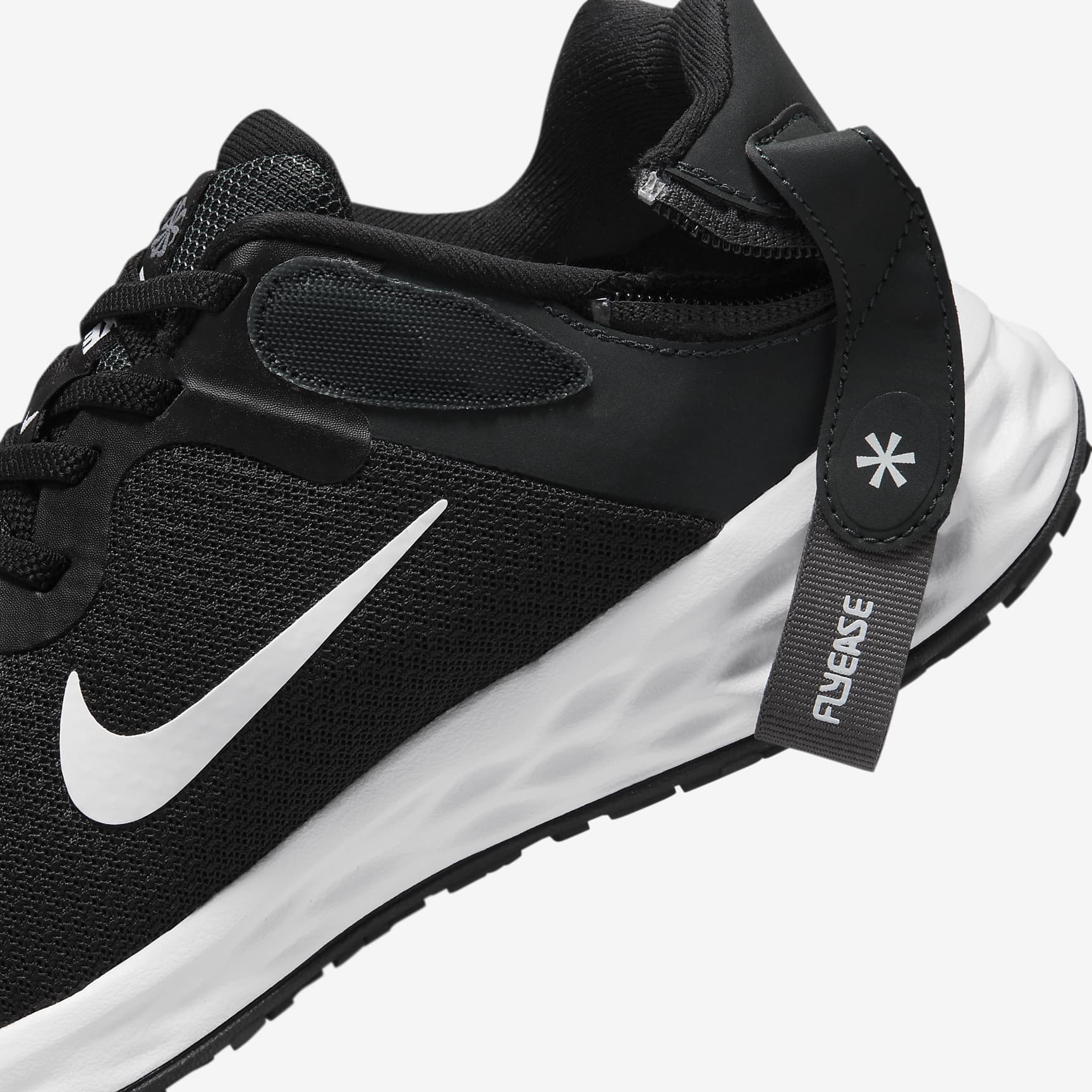 INTUITIVE COMFORT AND CUSHIONING. You won't compromise on comfort, so neither will we. An evolution of a favourite, you'll have a plush design with a softer ride than its predecessor—all while being made from at least 20% recycled material by weight. Ideal for running or casual wear, Nike FlyEase technology makes the shoes super-easy to get on and off. Easy Entry Nike FlyEase technology makes it simple to get these shoes on and off. A wraparound zip on the heel opens up the shoe, while a strap over the top secures your fit. Complete Comfort Plush, breathable material is placed at the forefoot and collar for a comfortable, secure feel. Additional skins throughout provide durability. More Flexibility, Softer Ride A full foam midsole delivers a softer ride than the Revolution 5. The outsole has a computer-generated design that creates a natural piston effect as you run, providing more cushioning and flexibility. They combine for durable traction.