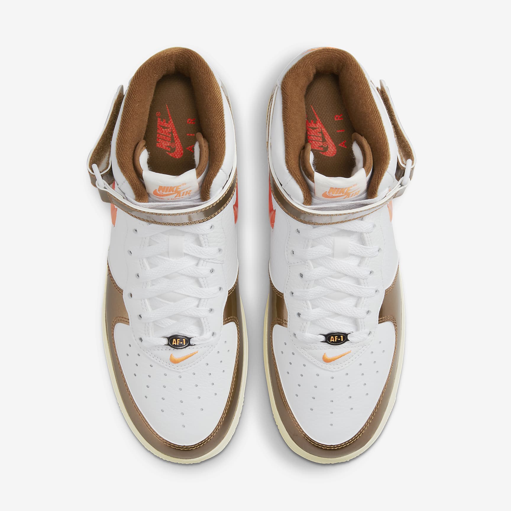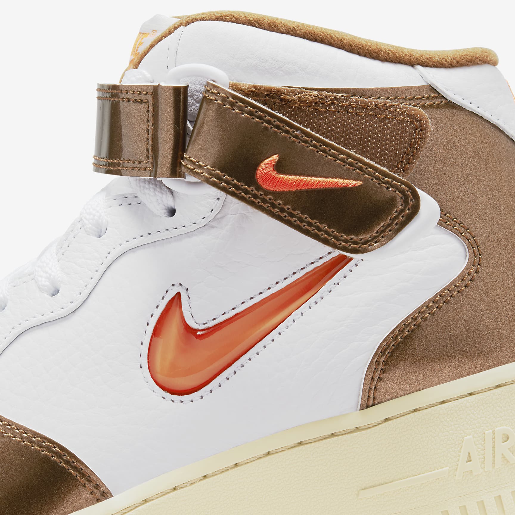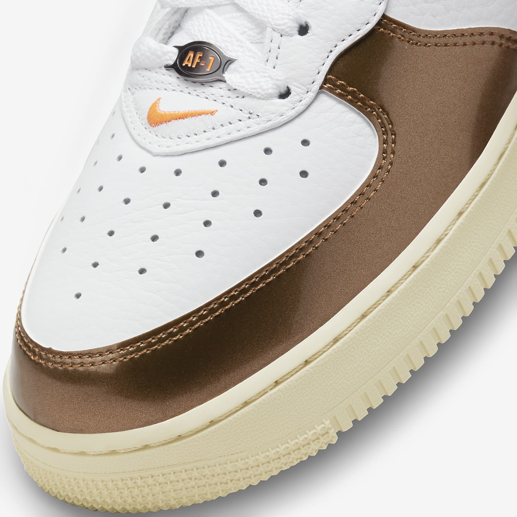 Celebrating those things we can't do without, this rendition of the hoops original aims to bring the outdoors inside and vice versa. Its witty Swoosh characters and sleek metallic finish put a fresh spin on what you know best: era-echoing, '80s construction, bold details and nothin'-but-net style. Open the box and transport yourself. Benefits * Embroidered characters on the inside of the tongue celebrate what's within. * Metallic overlays and supple leather deliver a premium off-court touch. * Brown and orange colourway nods to the original Nike shoe box. * From tough stitching to pristine materials to the cupsole design, it delivers durable style that's smoother than backboard glass. * Originally designed for performance hoops, the Air cushioning delivers lasting comfort while the padded ankle and tongue add to the soft ride. * Mid-cut, padded collar adds a classic look that feels great. Air Force 1 Debuting in 1982 as a basketball must-have, the Air Force 1 came into its own in the '90s. The clean look of the classic white-on-white AF-1 was endorsed from the basketball courts to the street and beyond. Finding its rhythm in hip-hop culture, releasing limited collabs and colourways, Air Force 1 became an iconic sneaker around the globe. And with over 2000 iterations of this staple, its impact on fashion, music and sneaker culture can't be denied.
