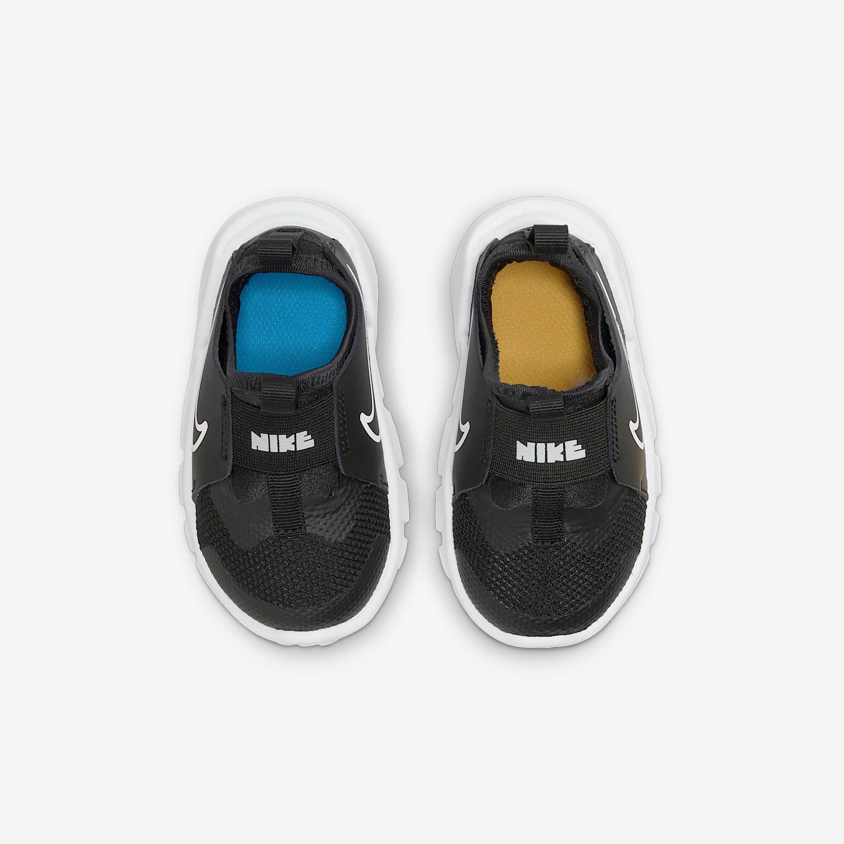 A SLIP-ON FOR LITTLE SPEEDSTERS. Who's ready to play? The Nike Flex Runner 2 is built for the kids on the go—from the cot to the playground to wherever their day takes them. It's laces free! Meaning it's super quick to slip on and off. The straps and bootie-like design make sure your little one's fit stays snug. Easy On, Easy Fit A stretchy bootie design makes it easy to slip little feet in with a snug and secure feel. A midfoot strap, a heel strap and leather on the sides stabilise the fit. Comfy Steps The flexible foam sole is designed with grooves so every step feels natural. The sole's pattern also helps with multi-surface traction. Steady Feel The back of the shoe features foam that creates a wing-like shape around the heel for extra stability when moving in different directions. More Benefits * Breathable fabric on the front of the shoe is lightweight and helps keep feet cool. * The toe tip is reinforced for extra durability for toe-draggers. * Pull tabs on the heel and tongue help make the shoe easy to get on and off.