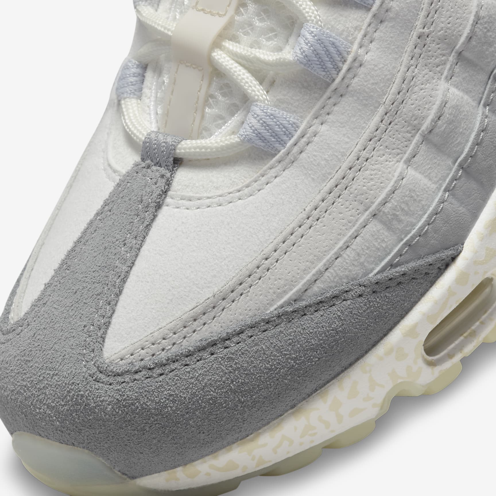 Move over milk, the power of the Air Max 95 is in town and it's got style you'll feel all the way to your bones. Taking inspiration from the human body and '90s athletics aesthetics, it taps into "The Anatomy of Air" with a skeletal-inspired colourway and midsole print representing the inside of a bone. Premium suede, glow-in-the-dark details and a surprise on the bottom finish it off. Benefits * Upper draws inspiration from the human body—the midsole represents the spine, graduated panels are the muscles and the laces are the shoe's ribs. * Originally designed for performance running, visible Air cushioning in the heel and forefoot puts the history of comfort beneath your feet. * Flex grooves in the midsole and outsole let you move freely. * Bone graphic on the outsole gives insight into what makes you move. Product Details * Glow-in-the-dark laces and outsole * Not intended for use as Personal Protective Equipment (PPE)