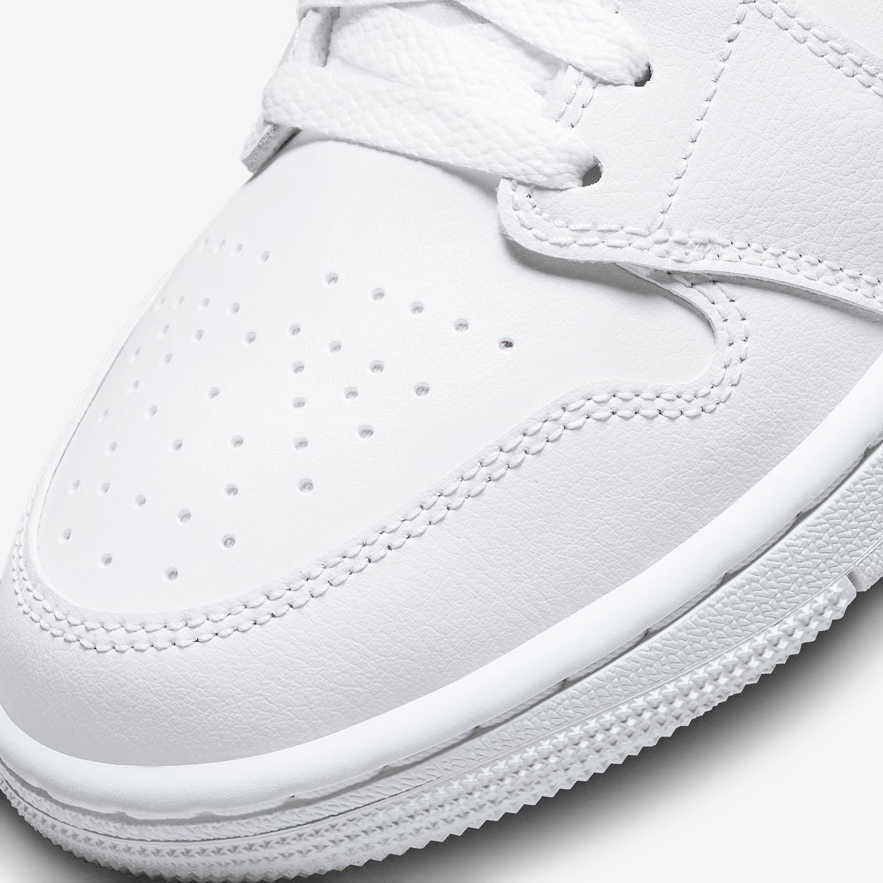Never mess with a classic. Keep heritage on your feet with a white-on-white look that will never go out of style. Benefits * Genuine and synthetic leathers provide superior durability and style. * Padded tongue and inner upper for added comfort and security. * Iconic winged Air Jordan logo on upper for traditional branding. * Encapsulated Air unit in the heel gives the lightweight cushioning you know and love. * Solid rubber outsole with tread for standard traction. Product Details * Stitched-down Swoosh logo * Wings logo on the collar