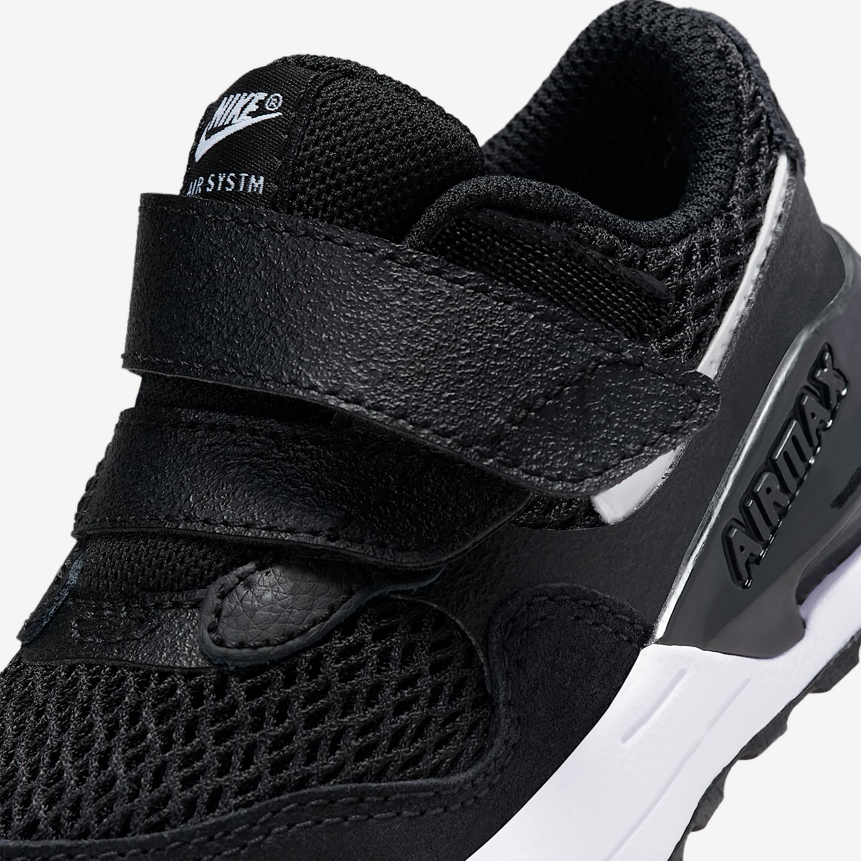 SHOWING OLD-SCHOOL LOVE WITH AIR. Cassette mixtapes. Music videos on TV. Mall arcades. The '80s were fun and wild! We’re celebrating that wicked cool era with the Nike Air Max SYSTM. From the big and bold Air unit to design lines (inspired by our favorite throwback Air Max shoes), it’s all about bringing back what’s cool to a new generation. Back to Our Roots Inspired by early Air Max icons, the visible Air unit brings lightweight cushioning underfoot. Plus, the wavy design lines from the past return with a new twist for the future. Comfy Fit Leather and textile bring a combination of durability and breathability so it’s comfortable to wear all day. Easy to Wear 2 hook-and-loop straps make the shoes easy to take on and off. More Benefits * Soft foam underfoot provides cushioning with every step. * A full-length rubber sole with a variety of traction patterns gives durable traction.